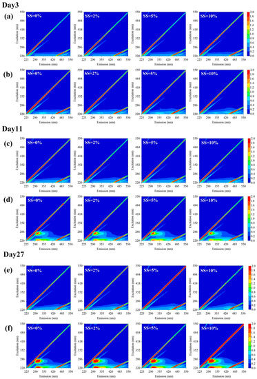 Excitation-emission matrix (EEM) for supernatant dissolved organic matter (DOM) fractions with different dosage of DWTS. (a,c,e): aerobic EAS; (b,d,f): anaerobic EAS.