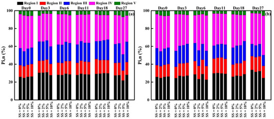 The percent fluorescence response (Pi,n) of supernatant samples after batch tests are shown in the Figure 8. For all the aerobic samples, the distribution order of Pi,n value was PIV,n > PI,n > PIII,n > PII,n > PV,n. For anaerobic samples, the Pi,n value of region IV and I was higher than other regions. The sum of PI,n and PIV,n was more than 60% for aerobic and anaerobic samples. These results indicated that soluble microbial by-product-like and tyrosine-like were the main contents of supernatant samples after both aerobic and anaerobic digestion. Meanwhile, it was found that the addition of DWTS result in different distribution of five regions for both aerobic and anaerobic conditions. For aerobic EAS, when the DWTS was dosed at SS concentrations of 2% and 5%, a gradual decrease in the sum of PI,n and PIV,n was observed, accompanied by increases in other Pi,n. The similar change tendency of PIV,n was found in the process of anaerobic condition except on day 6. It was reported that region I and IV were correlated to the biodegradable materials, and region III and V were associated with least and non-biodegradable compounds [58]. In general, therefore, it seems that the DOM released by DWTS could lead to the accumulation of non-biodegradable humic acid-like substance at the different stages of digestion.