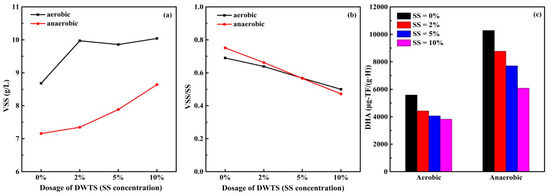 (a) Volatile suspended solid (VSS), (b) VSS/SS ratio and (c) dehydrogenase activity (DHA) in the precipitated sludge at the end of digestion for 27 days.