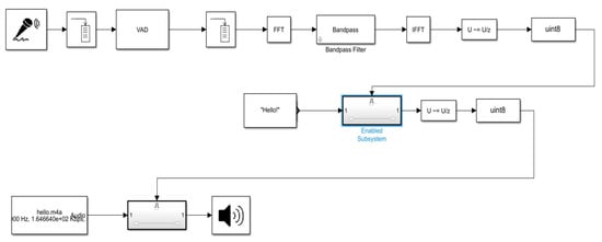 After applying the Fast Fourier Transform (FFT), we obtain the signal spectrum. The frequency of the human voice is in the 100 Hz–900 Hz frequency band. Next, the block called “Bandpass Filter” was chosen. This block filters the obtained signal and identifies frequencies included in the frequency band of the human voice. Filtering aims to eliminate background noise from the sounds identified as voice signals by the “Voice Activity Detector” block.