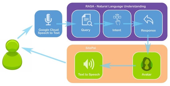 - The SitePal service [34]. SitePal offers avatars who can be directly displayed on websites and will play the text obtained by RASA NLU by voice (including lip-sync and facial and lip mimicry during speech). The avatar obtained through the SitePal service includes support for Text-to-Speech in Romanian. The SitePal service allows the creation of both bust and standing avatars. Users can choose from a wide range of models, but avatars can also be made based on specific photos. Moreover, the background can be customized or be left transparent. The only drawback of this service is that at the moment, the text-to-speech service in Romanian is available only with a female voice. Luckily, the representatives of the museum “Casa Mureșenilor” were only interested in this type of voice. We chose SitePal over similar services such as Living Actor or Media Semantics as the representatives of the museum found their avatars to be more appealing visually.