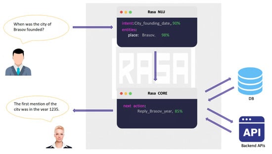 - The application developed using the NLU (Natural Language Understanding) RASA platform [33]. It takes the text and “understands” it, extracting the keywords and determining their semantical meaning. The answer is then processed and served to the user. The analysis and processing are performed directly on Romanian text, as the RASA NLU platform supports any language for its training pipeline. Any language for its training pipeline. We chose RASA NLU over other natural language processors such as NLTK, SpaCy, TensorFlow, Amazon Comprehend or Google Cloud Natural Language API, as this platform allows a facile re-configuration of the smart agent by easily adding new content/answers/narratives.