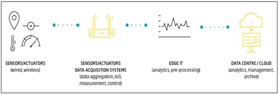 Applications and operational archetypal representation of the IoT network. It consists of the Things, which are objects connected to the Internet which utilizing their embedded sensors and actuators can sense the environment around them and gather the information that is then passed on to IoT gateways. The next stage consists of IoT data acquisition systems and gateways that collect the great mass of unprocessed data, convert it into digital streams, filter, and pre-process it so that it is ready for analysis. The third layer is represented by edge devices responsible for further processing and enhanced analysis of data. After that, the data are transferred to data centers which can be either cloud-based or local for further analysis [15].