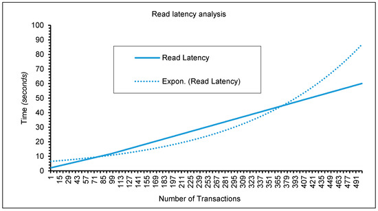 Read latency is the time required to fetch results and display them on the application interface. For analysis, initially, the read latency for 100 transactions is recorded and then extrapolated to 500 transactions. Figure 4 and Figure 5 show the read latency and read throughput analysis for 500 transactions, respectively. The trend in the graph shows that the number of transactions increases with time in seconds. With the increase in the number of transactions, the time required to read data from each block also increases, and hence it generates the linear curve. The throughput of the proposed model for Blockchain depends on the number of transactions. In the analysis of the results, it is observed that as the number of transactions increases, the throughput of the system also increases.