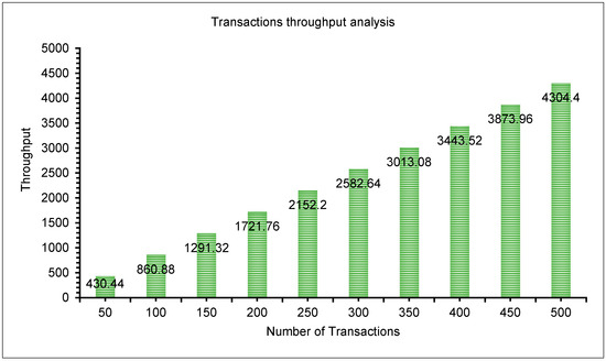 Transaction latency is the time required to confirm a transaction. It can be calculated by subtracting the confirmation time from the submission time. Transaction latency depends on the size of a transaction. Moreover, an increase in the size of a transaction consumes more power and hence causes more latency. Figure 6 and Figure 7 present results for transaction latency and throughput analysis for 500 transactions, respectively. Transaction latency depends on the transaction size. It is clear from the figure that the throughput of the system increases with the time, which means that the throughput of the proposed model for Blockchain depends on the number of transactions and frequency.