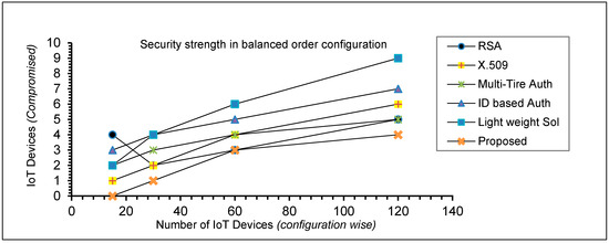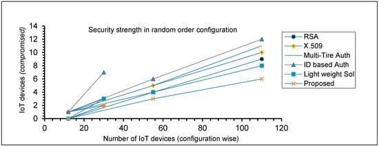 The healthcare frameworks are beset with challenges in assuring its users of the authenticity to provide integrity and privacy to their data. Blockchain technology can be used to benefit healthcare systems. For instance, the AVISPA tool is used for algorithm validation and evaluation of security strength. The results evaluation regarding security strength between IoT devices shows that information is exchanged securely. As a result, the proposed framework shows a 6.3% improved efficiency as compared to others. It is also observed that the proposed framework has improved the strength of security regardless of the number of IoT devices. Figure 8, Figure 9 and Figure 10 show the security strength of compromised IoT devices in balanced increasing order, imbalanced increasing order, and random order, respectively. If an eavesdropper aims to impersonate the legitimate device using a message, the associated device (i.e., access point, router) will reject the authentication request as it only accepts the random number-based calculated value, which is known to legitimate devices only. Results analysis shows that the proposed algorithm is more secure than others as their ratios are a bit higher.