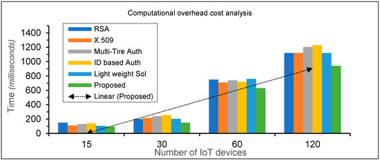 A small overhead has been observed in the authentication process due to the interactions. On average, overheads are lowered by 3.8% in IoT devices as compared to others. So, it has increased the information transformation. However, the overhead is due to random variable selection and mutual messages exchange for authentication, which cannot be ignored. Figure 11 shows the overhead cost observed, the plot shows the relation of time consumed in milliseconds and data processed in kilobytes. The network and bandwidth requirements for IoT networks can be optimized to increase QoS to provide instant response to the queries in life-saving applications in critical situations.