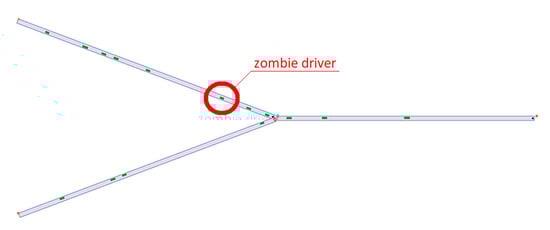 - The zombie driver frequency: The frequency according to which a driver will commit a driving “error” moving on a deviated trajectory—in all calculations performed in this work, as already stated, we considered every vehicle, every second of the simulation as moving on three deviated trajectories.