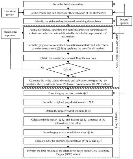 The paper proposes a new hybrid MCDM model based on a combination of Delphi, AHP, and CODAS methods in a grey environment to solve the defined problem. As the problem has a hierarchical structure with criteria, sub-criteria, and alternatives at different levels, it was justified to apply the AHP method to solve it. However, as the AHP method requires comparison of all pairs of elements (criteria, sub-criteria, alternatives) at the same hierarchical levels, and considering the large scale of the problem (large number of elements), the AHP method was used only to determine the criteria weights. The CODAS method was used for the evaluation of the alternatives and the final ranking, which significantly reduced the complexity of the problem. Since evaluations were performed by the decision makers representing different stakeholders for whom the considered criteria may have different significance, a part of the Delphi method that enabled the unification of the different evaluations was introduced into the model. The entire MCDM model was developed in a grey environment because it enabled the processing of partial data, as well as the combination of unclear and incomplete assessments by the decision makers. Below is a review of the literature on the methods that make up the model.