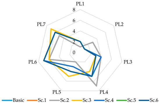In order to examine the stability of the obtained solution, a sensitivity analysis was performed in which the influence of changes in certain parameters on the result was examined. For this purpose, six additional scenarios were defined, the first of which (Sc.1) implied the equalization of the importance of all criteria, while the other scenarios implied the exclusion of one of the five most important criteria, i.e., the criteria with the greatest weight and thus the strongest influence on the potential location ranking. Criteria C6 (Sc.2), C3 (Sc.3), C13 (Sc.4), C5 (Sc.5), and C16 (Sc.6), respectively, were excluded in the scenarios. Changes in the ranking of potential locations in additional scenarios compared to the initial (basic) scenario are shown in Table 8 and Figure 2. As it can be seen from the conducted sensitivity analysis, in all scenarios except Sc.2, PL2 was ranked first and PL1 second. PL3 was ranked third in all scenarios except Sc.2 and Sc.4. The remaining potential locations were mostly ranked between fourth and seventh place in all scenarios, and the only step forward was made by PL5, which was ranked second in Sc.2 and third in Sc.4, respectively. Taking everything into account, it can be concluded that the obtained solution is sufficiently stable and that Zagreb (PL2), Ljubljana (PL1), and Belgrade (PL3) stand out as the most favorable potential locations, respectively. The worst locations for the opening of the DP terminal are Skopje (PL6) and Tirana (PL7), respectively.