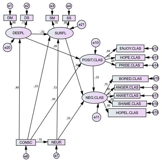 Predictive relationships of two Factors of the Big Five model (Conscientiousness and Neuroticism) on the Learning Approach and Achievement Emotions, in a Class Situation.