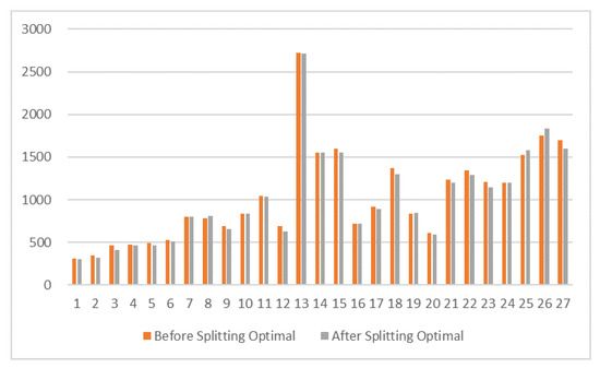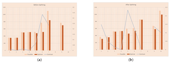 Figure 9a,b and Table 4 show the statistical comparison of the examples before and after splitting by our algorithm. Because the time window constraints is not considered in Gendreau et al. (2006) [7], there might be no feasible solution of some examples. According to the experimental statistical results, our algorithm obtains the feasible solution and the best solution of eight sets of data before splitting, two sets of data have no feasible solution, the average running time of the algorithm before splitting is 76.7 s and the best solution reduces the average distance of 9.39%. When comparing with the data after splitting, it is not difficult to see that only one set of data cannot be solved after the order splitting is added, which shows that the algorithm with order splitting can analyze and calculate more cases. Additionally, these results also mean the algorithm with order splitting can satisfy the time window constrains more easily. The average running time of the algorithm with order splitting is 84.2 s. Its best solution compared with the feasible solution average distance decreased by 9.09%, which shows that the algorithm can get closer to the approximate optimal solution in fewer iterations. Order splitting greatly improves the efficiency and accuracy of the algorithm.