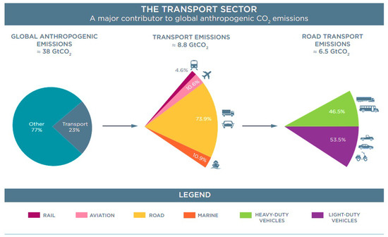Figure 1. As the global anthropogenic emission chart illustrates, the transportation accounts for 23% of global anthropogenic emissions, while the road transport emissions account for 73.9% of all transportation, LDVs and HDVs account for 46.5% of road transportation emissions.