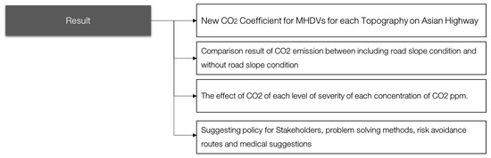 The development of a CO emission coefficient with varying topography conditions for MHDVs addition to consideration of health effects on the people was conducted. The study area is the part of the Asian highway in Thailand passing through different, highly geographically diverse regions of the country in order to analyze and create the model showing the CO emission coefficient in each road slope. The coefficient of CO emission will be determined by the multiple linear regression and validated by Huber–White robust standard errors for heteroscedasticity. Results from the study of CO emission by calculating a road slope condition resulting in a higher CO emission than 36.17% without a road slope condition, which affects the ability to formulate policies and plans for populations affected by pollution that is less than reasonable have been.