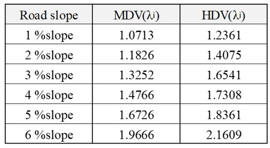 emission values of MDV for 1–6% slope are greater than flat road (0% slope) at 1.0713, 1.1826, 1.3252, 1.4766, 1.6726 and 1.9666 times, respectively. For HDV, the CO