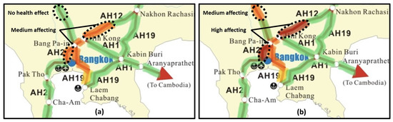 Figure 20), the red (Circle no.1) and orange (Circle no.2) lines indicate spots where residents near the Asian highway are subjected to health risks from CO