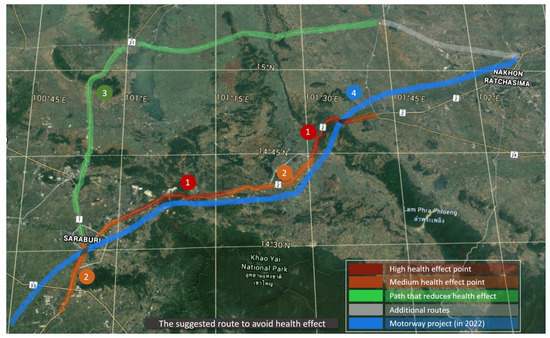 emission. The green line (Circle no.3) represents the route that leads into Road number 21 (Saraburi–Lomsak), which then leads into Road number 2256 heading towards Nakhon Ratchasima. The route is slated in the future to merge back into the Asian highway eventually but as of now a direct route into the province is unavailable. This study suggests that a road be constructed along the white line covering 44 km distance as an alternative route. The blue line (Circle no.4) represents the planned motorway by the Department of Highways estimated to begin operating from 2022–2023. The motorway, however, will present tolls for usage, which will add to cargo transportation expenses. Using the alternative route, which will ideally not be subjected to toll, should help alleviating this issue and reducing CO