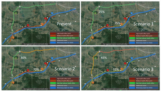 Figure 21), with health risk level projected to reduce from high to medium level should 25% of vehicles (Scenario 1) travel on alternative routes instead, and to low level should 30% of vehicles (Scenario 2) do so. Should more than 45% of vehicles (Scenario 3) choose to traverse the alternative route, however, residents along the route may begin to be subjected to increased health risks instead.