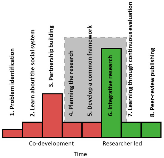 A key recurrent challenge in TD research is the limited understanding and prejudice among both researchers and practitioners about what TD research is and how it should be performed [103]. A structured TD social learning process occurs only when researchers and practitioners have built trust and can co-create a process of interaction between scientific knowledge and real world experiences [104]. This observation is in line with [105], who emphasized knowledge integration, quality criteria for assessment of the research process, and consideration of project partners’ different norms and values for a successful TD research process.