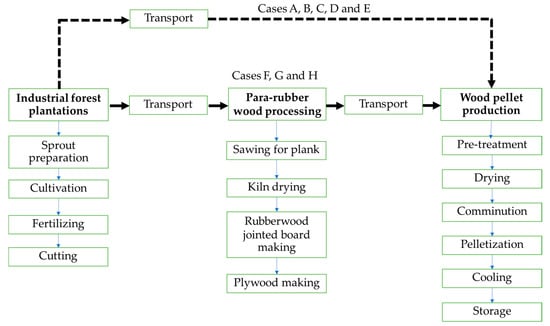 Transportation for Cases A, B, C, D, and E, starting from wood pellet factory to a farm is 100 km by 10-wheel truck, with 16 tonnes of rubber wood log (100% loading) 0% loading on the return trip. Cases F and G have two steps of transportation, 1st step starts from the para-rubber wood processing factory to a farm and the return trip, and 2nd step starts from the para-rubber wood processing factory to the wood pellet factory and the return trip. The transport conditions of the two steps for Cases F and G are the same as for Cases A, B, C, D, and E. Transportation of Case H also has two steps like Cases F and G, but the distance of the Factory F4 from the para-rubber wood processing factory is about 1000 km.