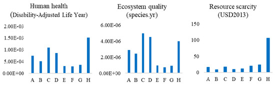 The results of comparing the midpoint environmental impacts for one tonne of wood pellet production for each case are shown in Figure 3 and Figure 4. The trend of comparing the midpoint impacts results in global warming, ozone formation, fine particulate matter formation, terrestrial acidification, terrestrial ecotoxicity, marine ecotoxicity and fossil resource scarcity are identical. The energy consumption of wood pellet production affects these environmental impacts, so Case B is better than Case A, and Case D is better than Case C. Global warming, human carcinogenic toxicity, marine ecotoxicity, and fossil resource scarcity of Case G are rather high, next to Case H. This is mainly caused by use of diesel in transportation, and electricity in wood processing and wood pellet production, which is similar to trends found in other studies [20,21].