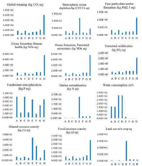 LCA in this study is calculated by SimaPro software (version 8.5.2.0) and the ReCiPe2016 Midpoint/Endpoint method (version 1.02) is used for the impact assessment [30]. This study includes the following 17 midpoint impact categories: global warming potential, stratospheric ozone depletion, ozone formation (human health), ozone formation (terrestrial ecosystems), fine particulate matter formation, terrestrial acidification, freshwater eutrophication, marine eutrophication, terrestrial ecotoxicity, freshwater ecotoxicity, marine ecotoxicity, human carcinogenic toxicity, human non-carcinogenic toxicity, land use, mineral resource scarcity, fossil resource scarcity, and water consumption. The endpoint categories are resources scarcity, ecosystem quality, and human health.