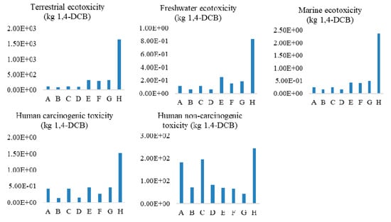 The midpoint environmental impacts (toxicity) for the eight cases of wood pellet production.