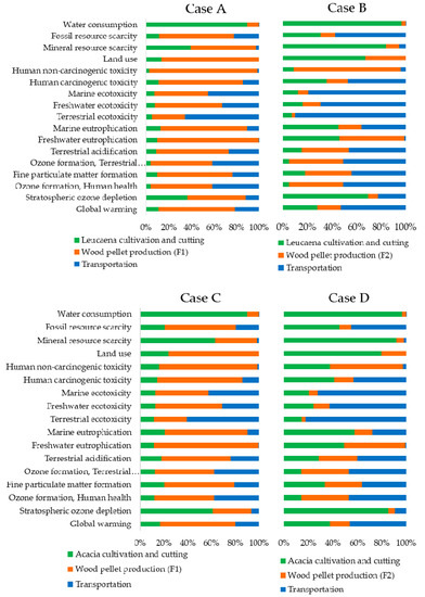 The contribution of the life cycle stages is similar for Cases A and C which consider wood pellets produced by the Factory F1 (Figure 5). The contribution of wood pellet production in Cases A and C are more than 50% in 13 environmental impact categories. These results are related to the energy consumption of the Factory F1 at 610 MJ per tonne of wood pellets. Likewise, the contribution of the life cycle stages is similar for Cases B and D which consider wood pellets produced by the factory F2. The energy consumption of the Factory F2 is only 46 MJ per tonne of wood pellets. Therefore, the most contributions in Cases B and D are from transportation which shares more than 50% in seven impact categories, and cultivation which shares more than 50% in three impact categories.