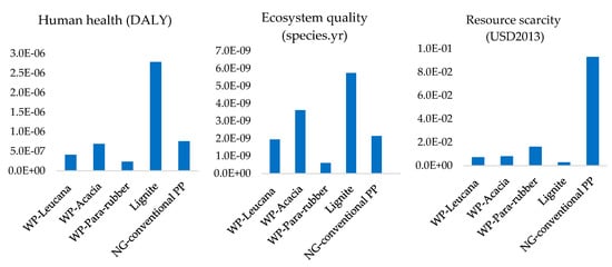 The endpoint environmental impacts for electricity production from acacia wood pellets, leucaena wood pellets, and para-rubber wood pellets, lignite, and natural gas (in conventional power plants) have been compared. The results of human health and ecosystem quality show that lignite has the highest impacts (Figure 7). The results of ecosystem quality are similar to human health, except that acacia wood pellets are higher than natural gas in ecosystem quality. This is from the higher use of resources for two crops of Acacia plantation in 10 years, which is more than the other crops. The use of wood pellets for electricity production can reduce the endpoint environmental impacts compared to lignite. Resource scarcity of wood pellets are lower than natural gas, but not lignite which has a very low value. This is because, although the quantity of fossil fuels is decreasing, there is still a lot of lignite available in Asia (4900 million tonnes in 2018), especially in China and Indonesia [45]. Hence, the environmental cost of lignite extraction still is lower than other fossil fuels.