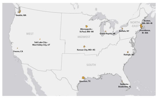 To select study areas, we first classified all of the U.S. Census Urban Areas into 12 categories defined by three different population sizes (more than 2 million, more than 1 million and less than 2 million, and more than 0.5 million and less than 1 million) and four U.S. regions (West, South, Midwest, and Northeast). As urban agglomerations with a continuously built-up area (also called metropolitan areas) commonly consist of at least a population of 0.5 million or higher [], we used this number as the lowest threshold and created categories enabling a selection urban regions of various sizes. Then, we selected one urban area from each of the 12 categories to obtain a geographically dispersed sample across the country. The 12 urban areas included in the sample also represent various population sizes (from 5.6 million in Houston, TX, to 0.6 million in Grand Rapids, MI), average temperatures (from 7.5 °C in Minneapolis-St. Paul, MN, to 23.5 °C in Sarasota-Bradenton, FL), and annual precipitations (from 8.7 inches in Fresno, CA, to 65.5 inches in Providence, RI-MA). These diverse characteristics both enhance the generalizability of our findings and allow for comparisons within the sample.