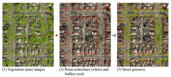 Following the NDVI standards used in earlier studies [,], we used an NDVI value of 0.12 or higher to identify any vegetated pixels from the aerial images. After creating vegetation raster images, we removed vegetation that cannot be accessed or viewed on public streets by using buffers around street centerlines to measure street-level greenery (see Figure 2). For the road buffers, we utilized the 2019 Census TIGER (Topologically Integrated Geographic Encoding and Referencing) Road shapefiles, and created a buffer from street centerlines of 100 feet (30.48 m) for main arterials, and a buffer of 50 feet (15.24 m) for local neighborhood roads []. The two different buffers take into account the width of the main arteries and neighborhood roads. Based on guidelines from the American Association of State Highway and Transportation Officials [], we estimated the total width of arterial streets—including more than two travel lanes, shoulders, sidewalks and front yards in each direction—as 200 feet (60.96 m). Applying similar logic, we estimated the width of local neighborhood streets with two travel lanes and other street elements as 100 ft.
