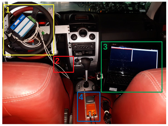 Overall layout of the system: 1. steering wheel torque sensor; 2. pedal load cell; 3. computer; and 4. inertial measurement unit and Global Positioning System (GPS) receiver.