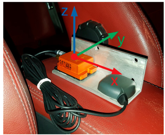 This electronic device implements internally an Extended Kalman Filter for sensor data fusion, combining information from different sources (accelerometer, gyroscope, magnetometer, altimeter, etc.) and increasing the accuracy and robustness of the estimation. The GPS + IMU device will be used to measure position, velocity and acceleration, logging data at a sampling rate of 100 Hz. It is important to highlight that it fulfils the IP67 regulation, so it provides additional robustness to the system. Additionally, it has a 9-pin mini DIN (Deutsches Institut für Normung) port, so it is directly connected by USB to the computer. The GPS + IMU device must be mounted in the vehicle’s centre of mass or in the nearest possible position and can be fixed by using double sided tape or any other reliable fixation method. It is important to follow the product user’s guide to determine the correct orientation of the device with respect to the XYZ axis of the vehicle, as showed in Figure 3. In this case, a positive X was the forward positive direction of the vehicle.