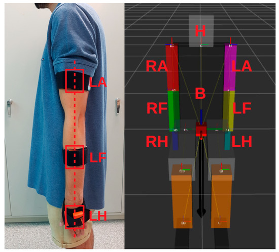 As specified before, a set of 8 human motion trackers was used to log the movements of the driver. Distribution of motion trackers on the driver is showed in Figure 4. In order to achieve a good model of the human body, it is advisable to fit the motion tracker while in a resting position, the three devices of the arm creating a vertical line, as represented in Figure 4. Each motion tracker is associated with an upper body element, with A, F and H being the arm, forearm and hand, respectively; where L refers to left side and R refers to right side. The head (H) and back/body (B) are also tracked by the motion capture system.