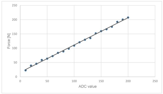 The same methodology must be followed to calibrate each pedal’s load cell (brake and throttle). In this case, the force must be applied perpendicularly to the cell surface, so that it is aligned to the measurement gauge. Figure 6 shows the calibration of the brake’s load cell, with the throttle’s load cell values being very similar. It can be clearly observed that the data is linear, so the regression can be fitted to a straight line.