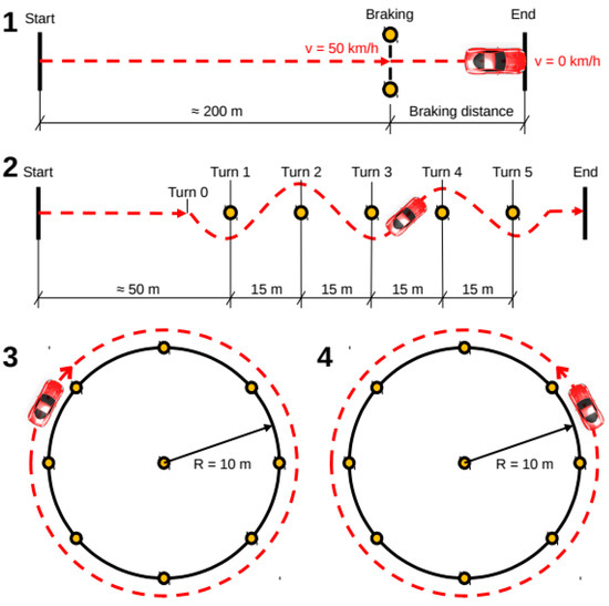 Testing scenarios: 1. braking; 2. slalom; 3. roundabout 1; and 4. roundabout 2.
