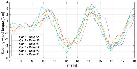 In Figure 8, the steering torque results of the slalom tests (2 per driver, 6 in total) are shown. As can be seen, all tests show the same overall values, with peak values of 4 Nm clockwise and counterclockwise, that represents a force of 24.2 N on the steering wheel periphery, taking into account a steering wheel diameter of 0.165 m. The data plotted for different drivers and vehicles presents overall similar maximum and minimum values. It is important to remember that, as noted in Table 1, both vehicles have power steering.