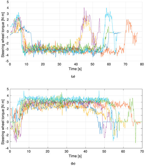 Figure 9 shows the plots obtained for the torque measured on the steering wheel during the 12 roundabout circulation tests carried out, 6 of them clockwise and the remaining 6 counterclockwise. Regardless of the direction of rotation, it can be seen in both images that the torque margin obtained at the steering wheel periphery varies between a value from 2 to 4 N m, obtained during a steady-state vehicle speed of 30 km/h along a period of 30 s. This torque represents, taking into account the distance of 0.165 m between the point of application of force on the steering wheel and the centre of rotation, a force of 12.12 N to 24.24 N.
