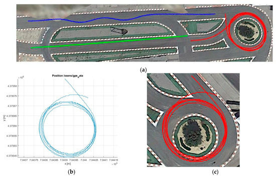GPS sensor data of the scenarios: (a) scheme of the different driving test scheduled, with blue representing slalom, green representing braking and red representing roundabouts; (b) trajectory obtained during the roundabout test using the Inertial Measurement Unit (IMU) sensor; and (c) trajectory obtained during the roundabout test from a GPS sensor.