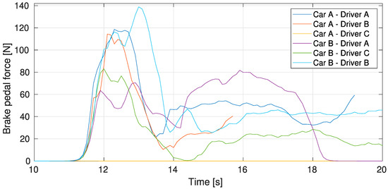 Regarding the braking scenario, the maximum measured force has an average value of 137.5 N and the minimum peak force has an average value of 85.6 N, as showed in Figure 11. As well as in the previous scenario, the data follows a common pattern, except the purple line, where the driver was not able to brake correctly at first instance and kept the brake pedal pushed.