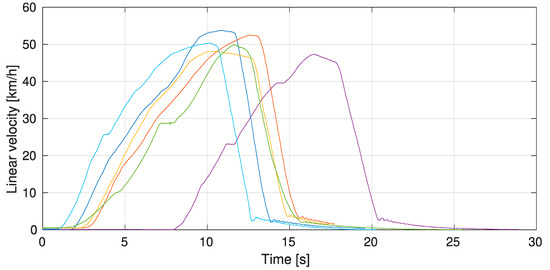 Figure 12 shows a representation of the results obtained for linear vehicle speed during the braking test. In this figure, it can be seen that, in all tests, the drivers brake suddenly when the linear speed has a value between 49 to 53 km/h. The purple line is offset in time due to the codriver in that test starting the DAS ahead of time. It can also be appreciated in the light blue, green and purple lines that the initial increasing slope (when the vehicle is accelerating) presents a series of steps. This is due to the fact that these tests were carried out with vehicle 2 that has a manual transmission, so these small speed losses are caused by gearbox changes. On the other tests, carried out with vehicle 1 with automatic transmission, this does not happen in a notable way. Finally, a similar tendency in braking behaviour and maximum speeds for all the tests can be observed.