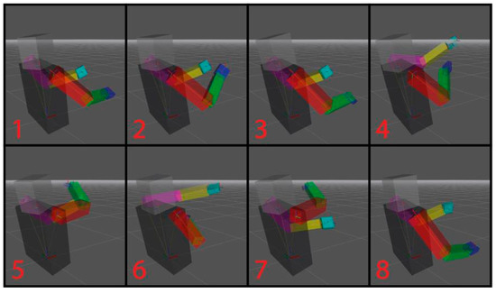 Figure 13 shows a reconstruction of the 3D model of a driver who performed a lane change trajectory test (slalom) in which a vehicle with manual transmission was used. In the first action (1), the driver held the steering wheel with their left hand while their right hand placed the gearbox lever into first gear. Next, the driver placed both hands on the steering wheel (2), driving in a straight line to approach the area where the cones were circumvented. Next, the driver held the steering wheel with their left hand and, with the help of their right hand, engaged second gear (3). In the next position (4), the driver placed both hands on the steering wheel again, turning it to the left to perform the manoeuvre to circumvent the first cone, which is on the left side of the vehicle. In the following movement (5), the driver turned the steering wheel totally with both hands to the left to pass between the first and second cones. In the manoeuvre (6), the steering wheel turned to the right again with both hands, so that the vehicle circulated between the second and third cones. In the following manoeuvre (7), the vehicle circulated between the third and fourth cones when turning the steering wheel to the left. Finally, in the manoeuvre (8), movement is represented once the fourth cone has been circumvented and the driver left the fifth cone on their left side and arranged to place the gear lever into neutral position.