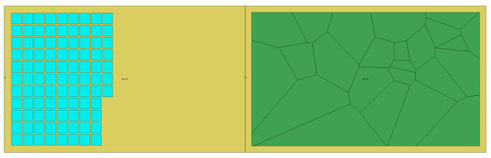 Figure 3 (left)). The number of rectangles is equal to the number of resources, and the size of each rectangle was calculated according to the ratio of the numbers and areas of the polygon of the KP. The more resources, the smaller the rectangles and the worse the result. Second, we divided the polygon of the KP into Voronoi polygons based on the quantities of the learning resources.
