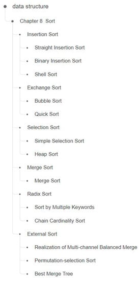 Figure 5 shows part of the hierarchical tree of the data structures course. The top node is the root, which identifies the course (e.g., data structures). We represented the data with several levels (i.e., grade, semester, chapter, section, HCU) according to the organizational structure. As mentioned, the method presented herein considers only the hierarchical structure, not the meaning of each level. The hierarchical tree of the original data was the table of contents of the course, which was extracted from the textbook published by the government education press of China. The levels of the tree may vary by book. We used an XML structure to store the information assigned by teachers. The tags of the XML file corresponded to the hierarchical levels. We added independent quaternions to each HCU as attributes. The values of the attributes could be assigned either manually or automatically.