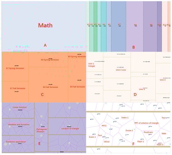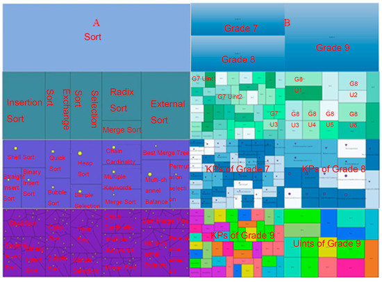 Figure 5, the first level can be partitioned into two parts for the data structures course and three parts for the English course. The data structures course consists of one left and one right pattern, while the English course includes two left parts that are tiled horizontally and one right part. At the second level, the data structures and English parts have the same partition results. We assigned a different color to level 3, and we assigned the leaf level according to the volume information of the node based on the categorization. Due to the fact that the same structure was used for the hierarchical structures of the data structures and English courses, the maps of these courses have the same number of levels and can thus use the same scale to display the levels corresponding to grade, semester, chapter, section, and HCUs. When the map is generated, the colors can be assigned based on the target of the application. That is, any of the cartographic rules can be applied to the target map or to maps on different scales.