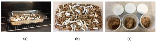 Figure 1. (a) CBW were dried in the oven; (b) CBW separated from the outer paper; (c) CBW mixture. - Water with the technical characteristics stablished by standard UNE EN 13279-2 [24]