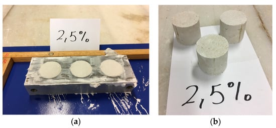 The following tests were conducted: density, superficial hardness, flexural and compression strength, bonding strength and acoustic behavior. For the density, superficial hardness and mechanical strength, several series of three specimens 40 × 40 × 160 mm3 were prepared with the different percentages of CBW and were further tested following the standard EN 13279-2 [24]. For the bonding strength test, the standard EN 13279-2 was followed and a Dynatest DTH 500 device was used to obtain the results [24]. The sound absorption test was done using the “two-microphone” or “transfer function” method, established by standard ASTME1050 and ISO 10534-2 [25,26]. This test method uses a Kundt’s tube and two microphones. The test sample was mounted at one end of the impedance tube. Flat waves were generated in the tube by a sound source (white noise), and the sound pressures were measured at two positions near the sample. The complex acoustic transfer function of the signals in the two microphones was used to calculate the absorption coefficient for normal incidence. For the acoustic test, three test tubes of each compound containing different percentages of CBW were made (Figure 3a,b). In total, 0.5 CB samples were not performed for the acoustic test, because the small amount of CBW contained in that sample was not considered enough to provide conclusive sound absorption results.