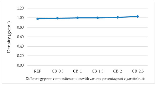 Firstly, sample tests were dried and weighed in order to know the density of different percentage gypsum compounds. Figure 5 shows that the density slightly increases as the amount of CBW increases. However, this density increase is not relevant and must be taken it into account when analyzing the mechanical properties. The point is to study how mechanical properties improve in reference to density and how this improvement is related to the percentage of CBW.