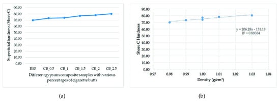 These results showed superficial hardness increased up to 14.87% when CBW percentages were increased. In addition, all values remained above the sample reference and the minimum regulations. These data mean that Shore C hardness increases as the CBW’s proportion increases. This result was expected since fibers generate an integrating net between gypsum particles, which greatly benefits the hardness. In addition, proportionally, greater increases are achieved with lower densities, which allow one to obtain good hardness with very low densities.