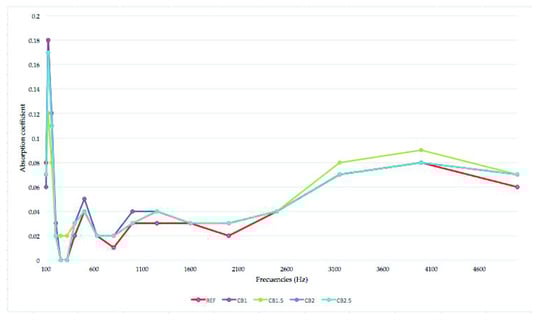 As it can be seen, the values of the standard deviation are very small (three decimals are needed to notice it), giving an idea of how clustered the data are around the mean. The results show minimal differences between reference samples and samples with different percentages of CBW. This can be clearly appreciated in Figure 10. According to the Catalogue of constructive elements of the Código Técnico de la Edificación (CTE: Main Spanish Construction Regulation), it has obtained similar results from an average gypsum panel: 125 Hz: 0.10; 250 Hz: 0.10; 500 Hz: 0.05; 1000 Hz: 0.04; 2000 Hz: 0.07; 4000 Hz: 0.09. In the case of acoustic plaster plates, it is not possible to make an accurate comparison since the increase absorption in these panels comes from the perforations and not from the material.
